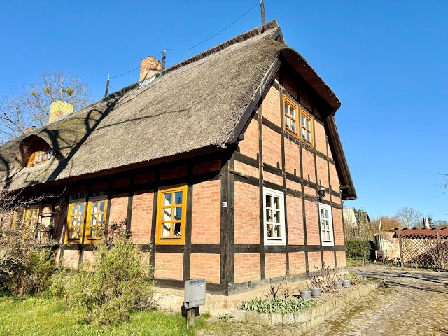 Bei diesem Immobilienangebot handelt es sich um eine Doppelhaushälfte in Alt Rehse bei Neubrandenburg. Das Haus steht unter Denkmalschutz. Es ist ein Fachwerkhaus mit einem Reet gedeckten Dach und zwei besonderen Fledermausgauben. Im Erdgeschoss des Hauses befinden sich das Wohnzimmer, das Esszimmer, ein Schlafzimmer, die Küche, der Hauswirtschaftsraum und das Bad. Von der Küche aus gibt es einen direkten Ausgang auf das Grundstück. Im Dachgeschoss befinden sich drei Zimmer und das Bad. Zwei der drei Zimmer haben eine sehr schöne Gaube. Auf dem Grundstück befinden sich eine Garage, ein großer Carport, eine Terrasse mit massivem Grill und ein Gartenhäuschen.